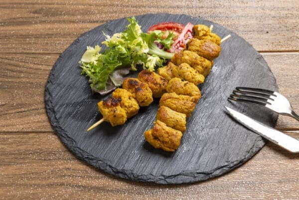 Lista de ingredientes: Proteína de guisante y haba rehidratada, aceite, vinagre de manzana y especias pinchito (sal, azúcar, antioxidantes (E-301, E-330), acidulante (E-262).