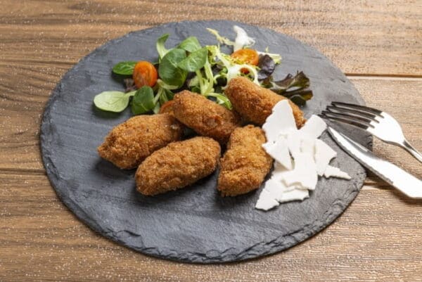 Lista de ingredientes: Bebida de soja, soja texturizada, preparado alimenticio sabor blue (margarina*(coco y girasol), almidón, agua, aromatizantes, sal y antiaglomerante (almidón de maíz)), aromas, aceite de oliva, harina de trigo, cebolla, preparado de harinas (harina de trigo, harina de arroz, acidulante E-334, gasificante E-500ii, colorante (E-160b)), pan rallado de trigo, agua, almidón de maíz, sal, azúcar, ajo, nuez moscada , romero.