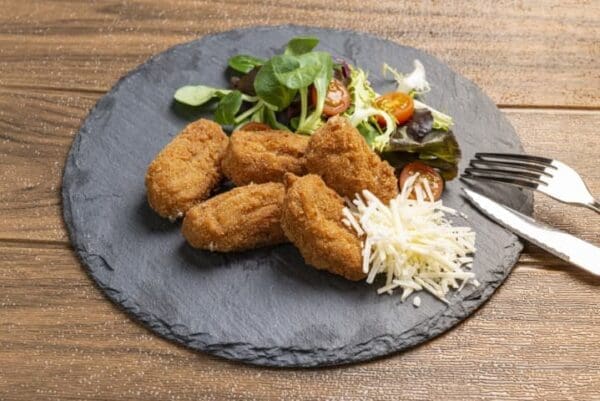 Lista de ingredientes: Bebida de soja, soja texturizada, preparado alimenticio sabor manchego (margarina*(coco y girasol), almidón, agua, aromatizantes, sal y antiaglomerante (almidón de maíz)), aceite de oliva, harina de trigo, cebolla, preparado de harinas (harina de trigo, harina de arroz, acidulante E-334, gasificante E-500ii, colorante (E-160b)), pan rallado de trigo, agua, almidón de maíz, sal, azúcar, ajo, aromatizantes, nuez moscada , romero.