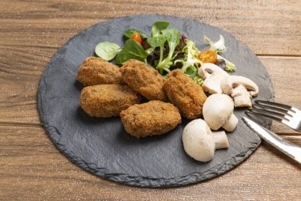 Lista de ingredientes: Bebida de soja, soja texturizada, harina de trigo, champiñones (11,4%), aceite de oliva, harina de trigo, preparado de harinas (harina de trigo, harina de arroz, acidulante E-334, gasificante E-500ii, colorante (E-160b), pan rallado de trigo, agua, almidón de maíz, seta shiitake (1,5%), sal, azúcar, ajo, pimienta negra y nuez moscada. Contiene soja y gluten.
