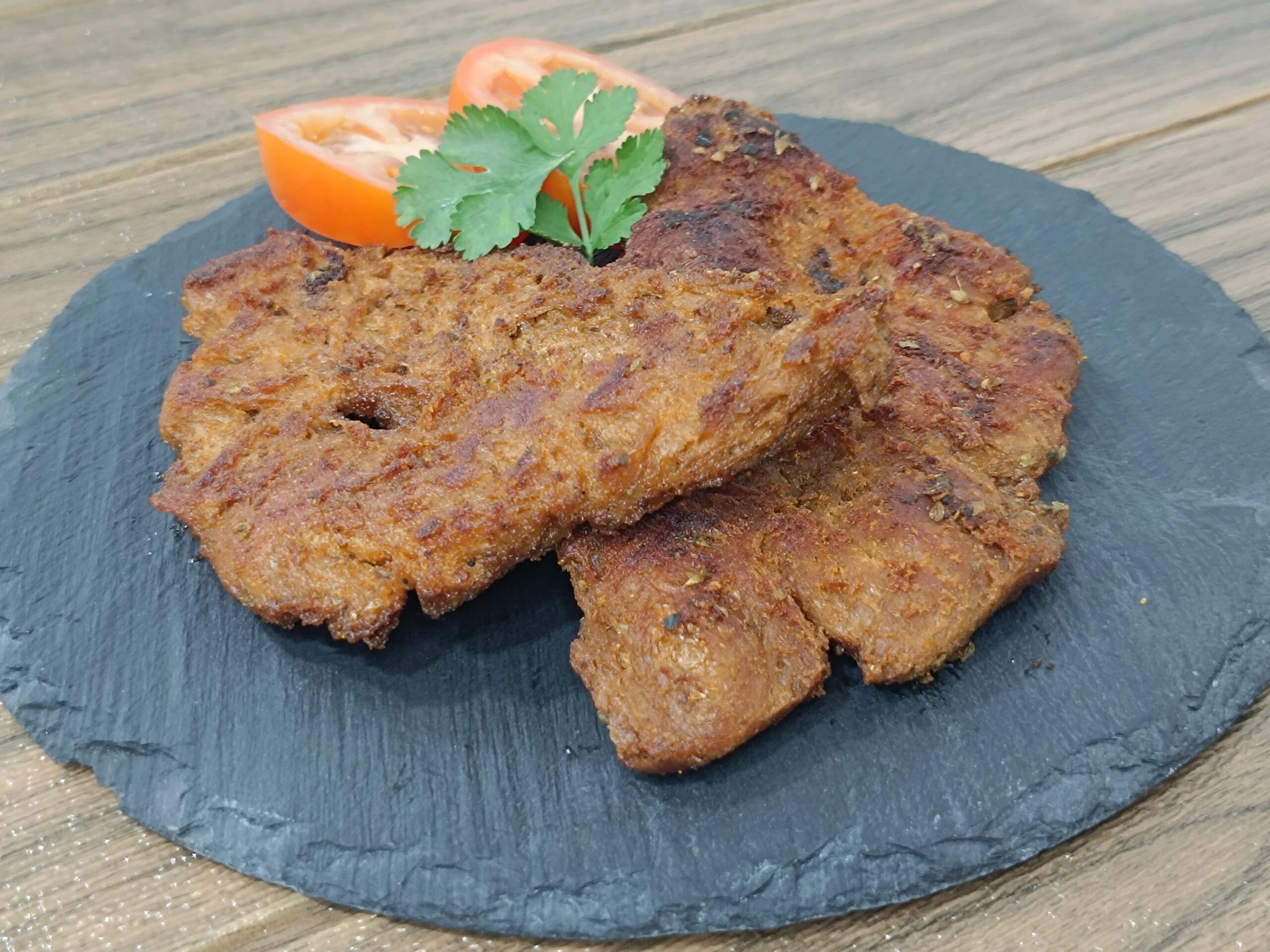 Lista de ingredientes: agua, Harina de soja no OGM desgrasada, harina de arroz y harina de alubia, aceite girasol, salsa soja (Agua, Soja (8%), Trigo y Sal. Sin conservantes.) polvos barbacoa (pimentón, pimienta, sal, curry (mostaza, cúrcuma, cilantro, alholva, hinojo, comino, sal, cebolla, pimienta cayena, apio y ajo) cebolla, ajo, potenciador sabor E-621, humo liquido (Agua, vinagre, aroma de humo de Hickory líquido, colorante caramelo (E150d), emulsionante E433.)