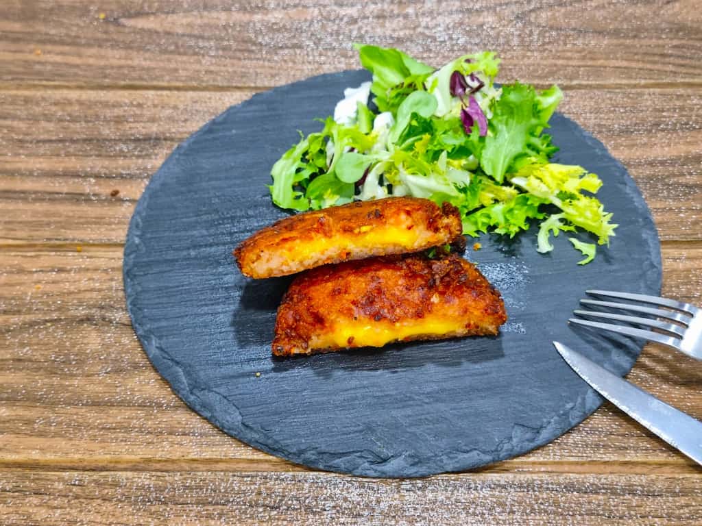 Lista de ingredientes: Agua, harina texturizada (guisante), harina de arroz, vegetales deshidratados (cebolla, zanahoria), sémola de maíz, copos de patata, fibras vegetales (guisante, bambú), almidón (patata), sal, aromas, jugo de remolacha en polvo, acetato sódico E-262, especias, citrato sódico E-331, aroma de humo, aceite de girasol ,preparado vegetal sabor cheddar (Agua ,grasa de coco , almidón modificado*,sal marina ,carragenina y goma de algarroba(estabilizantes),calcio(fosfato tricálcico),harina de arroz, aroma ,fibra cítrica, acido sórbico ,ácido cítrico , ácido láctico( reguladores de acidez),colorante natural: betacaroteno.)(*) no modificado genéticamente.