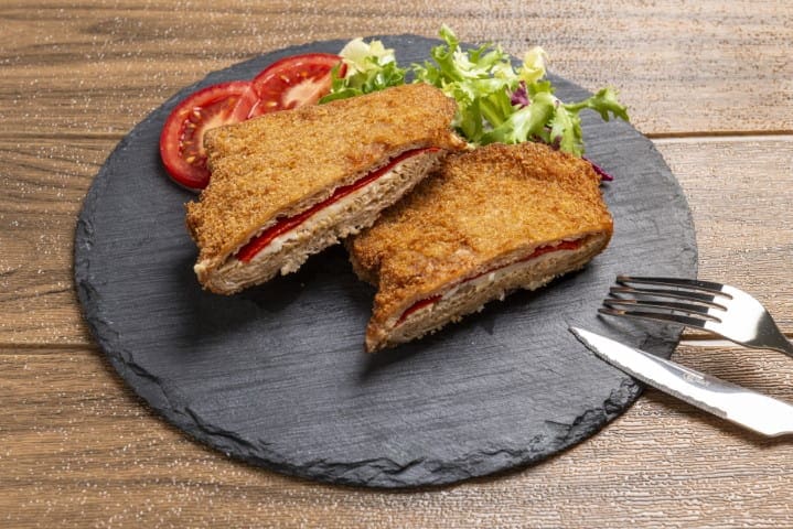 Lista de ingredientes: Soja texturizada, preparado alimenticio sabor vegano azul (agua, almidón, grasa de coco, sal marina, calcio (fosfato tricálcico), aromas, fibra cítrica, extracto de aceite de oliva, colorante natural: betacaroteno y alga espirulina.), pimiento del piquillo, preparado de harinas (harina de trigo, harina de arroz, acidulante E-334, gasificante E-500ii, colorante (E-160b), pan rallado de trigo, almidón de maíz, agua y sal.