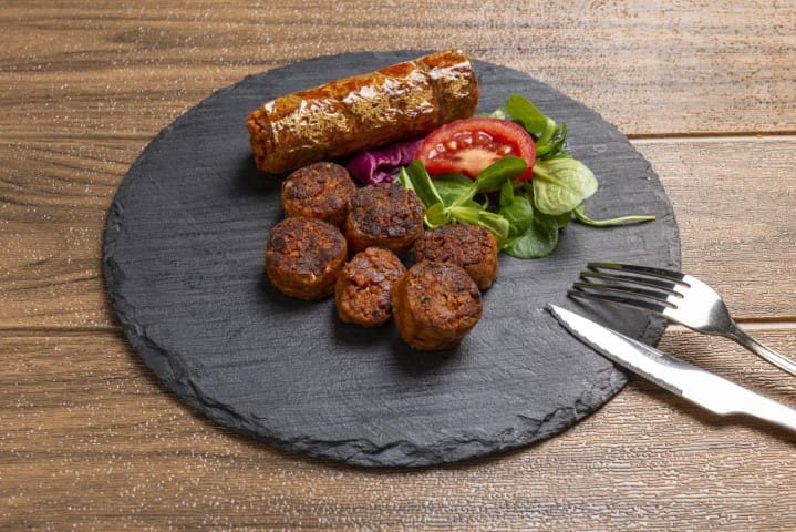 Lista de ingredientes: Proteína de guisante y haba, aceite de oliva, ajo, cebolla, pimentón, sal, orégano, goma guar y envoltura vegetal a base de algas.