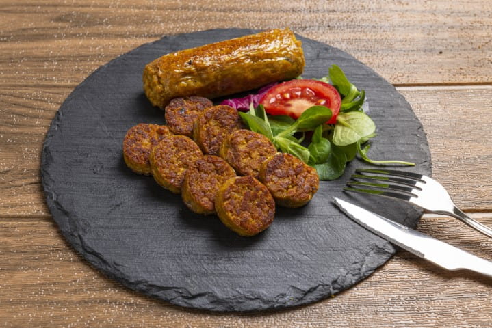 Lista de ingredientes: Proteína de guisante y haba, aceite de oliva, ajo, cebolla, ras el hanout, sal, orégano, goma guar y envoltura vegetal a base de algas.