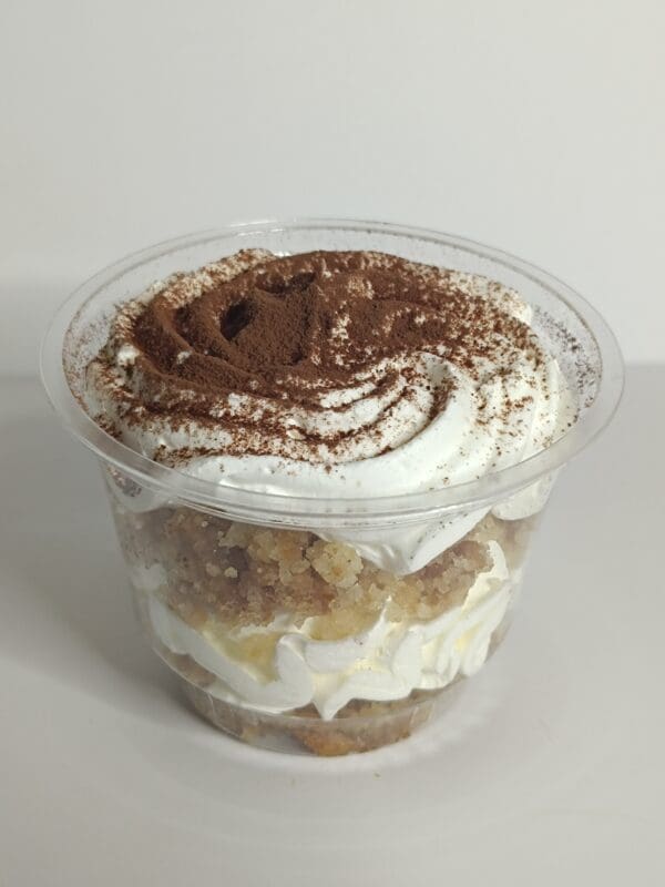 Lista de ingredientes: Nata vegetal: (agua, aceite de palmiste totalmente hidrogenado, azúcar, estabilizante (jarabe de sorbitol (E420ii), hidroxipropilmetilcelulosa (E464), carragenato (E407), carboximetilcelulosa sódica (E466), goma tara (E417), goma gelana (E418)), emulgente (polisorbato 60 (E435), monoestearato de sorbitán (E491), ésteres mono y diacetil tartárico de mono y diglicéridos de ácidos grasos (E472e), estearoil-2-lactilato de sodio (E481), lecitina de soja (E322)), aroma, corrector de acidez (hidrogenofosfato disódico (E339ii), citrato trisódico (E331iii)), sal, colorante (carotenos vegetales (E160a(ii) . Bizcocho (harina de trigo, bebida de soja, azúcar, aceite girasol, vinagre de manzana). café soluble, cacao, licor amaretto (5%) (alcohol rectificado de melazas, Agua, Azúcar, Aromas Colorante: E-150d, E-124, E-102 y E-110).